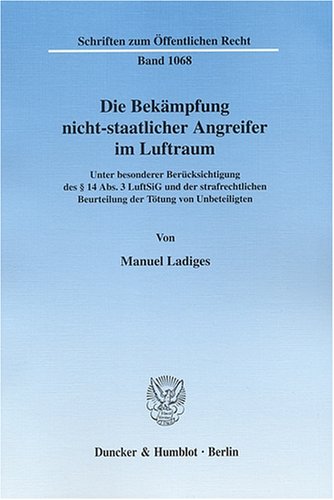 Berlin: Duncker & Humblot 2007 (Schriften zum Öffentlichen Recht 1068); 557 S.; 86,- €; ISBN 978-3-428-12436-7Rechtswiss. Diss. Greifswald; Gutachter: W. Joecks, C. Classen. – Ladiges fragt, in welcher Weise die Bundesrepublik auf mögliche Angriffe aus der Luft durch nicht-staatliche Organisationen reagieren kann. Gestattet das Grundgesetz in diesem Fall einen Einsatz der Streitkräfte innerhalb der Bundesrepublik? Das nach den Anschlägen vom 11. September 2001 erlassene Luftsicherheitsgesetz hätte den Einsatz der Bundeswehr im Innern auf der Grundlage des Katastrophennotstandes gemäß Art. 35 des Grundgesetzes ermöglicht. Die zentrale Norm des Gesetzes, die den Abschuss eines Luftfahrzeuges vorsah, wurde jedoch vom Bundesverfassungsgericht für nichtig erklärt. Der Autor analysiert sowohl das Gesetz als auch das Urteil und kommt in dieser rein juristischen Untersuchung zu dem Ergebnis, dass die Bundeswehr bewaffnete Angriffe von außen bekämpfen darf, soweit die Polizeikräfte hierzu nicht in der Lage sind.