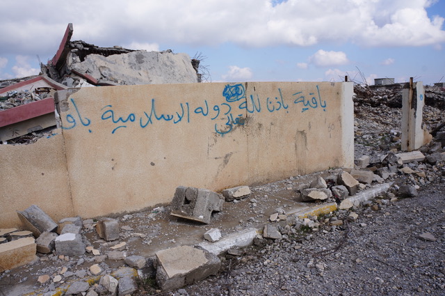 Eine zerstörte Mädchenschule mit dem Schriftzug „Durch die Gnade Gottes existiert der Islamische Staat und wird sich ausbreiten“; aufgenommen im Sindschar, Irak. © Michael RohschürmannSo wird in der Ausbildung von Predigern und Imamen gezielt „auf die Konstruktion einer eigenen religiösen Lehre, einer eigenen Lesart der Geschichte“ (19) abgezielt, in der der militärische Aspekt der islamischen Geschichte eine zentrale Rolle einnimmt. In geringerem Maße ist dies auch Teil der praktischen Ausbildung der Kämpfer in den Trainingslagern. Damit wird die Idee, der „wahre“ Islam sei kriegerisch, zum Kernpunkt der IS-Ideologie und militärische Erfolge zum zentralen Qualitätsmerkmal eines Kalifen. Diese Verknüpfung zeigt sich zum Beispiel darin, dass im Fastenmonat Ramadan auf IS-Kanälen immer wieder auf die Kämpfe des Propheten verwiesen wird, um Kampf als bevorzugte islamische Handlung zu suggerieren. Ausdruck dessen sind auch die exzessiven Präsentationen (angeblich) religiös gerechtfertigter Gewalt und genüsslich zelebrierter Hinrichtungen.